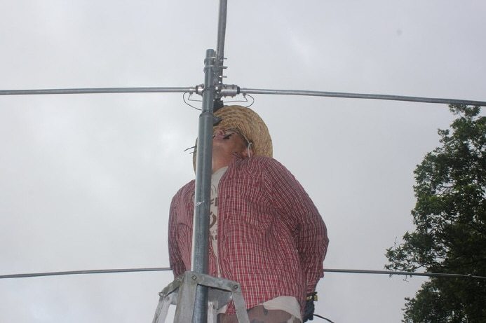 Glenn attaching feedline and tie-wrapping to boom.