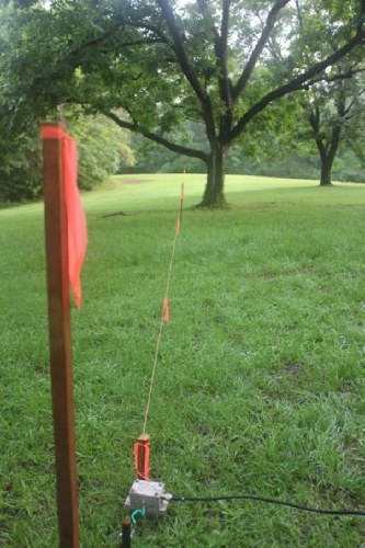 After we got the 2 wire TX antennas (40M CW dipole and 7-Band OCF for SSB) we decided to run a quick 300' beverage RX antenna pointing pretty much N, maybe slightly NNE... The feedpoint was set near the camper and termination ran along the pecan orchard to the far end of the field...