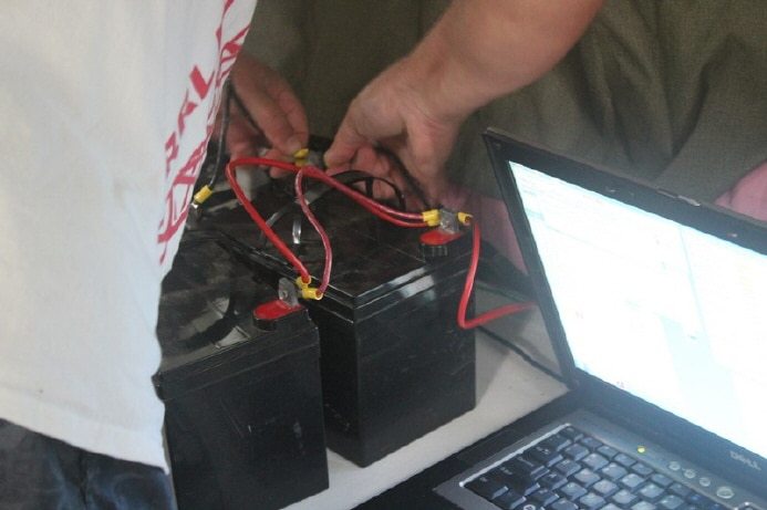 Disconectting the AC/DC power supply to the station and connecting up the batteries... 2 x 35 AHr sealed AGM batteries.