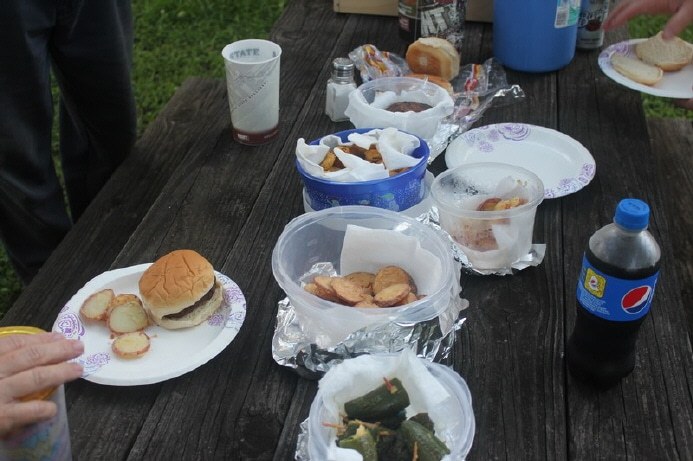 Hamburgers not long from the cow, fried squash, stuffed jalapenos and fried new potatoes... YUM, YUM!!!