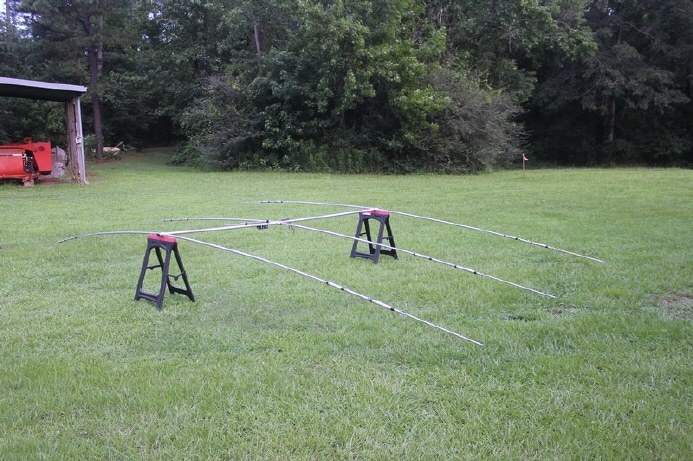First order of business after positioning the camper was to assemble and raise the 2 TH3JRS tri-banders. Here is the CW one ready to go up.